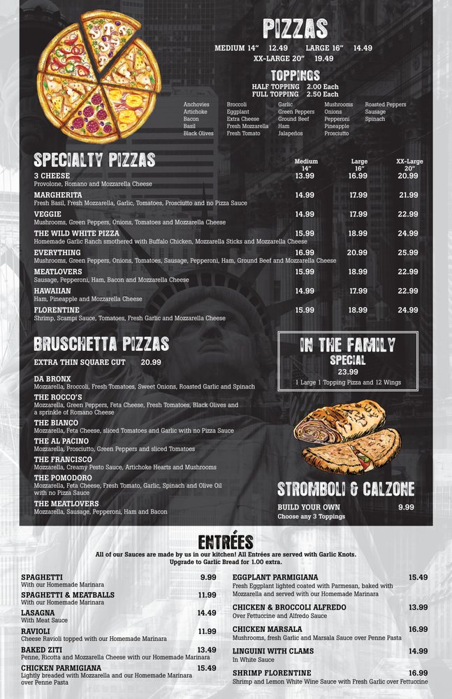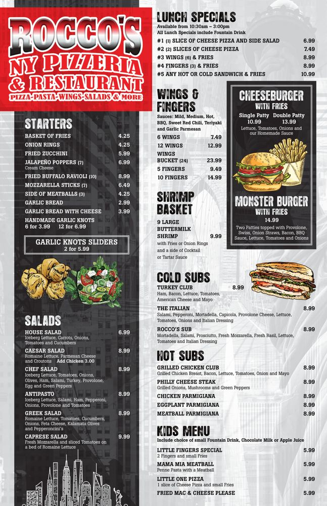 Rocco’s NY Pizzeria in North Las Vegas offers a wide range of amenities and a diverse menu catering to various preferences. From starters like fried zucchini and onion rings to extras like ranch and marinara sauce, the options are abundant. Customers have raved about the authentic New York-style pizza slices, eggplant Parmesan, and meat lover's pizza, highlighting the fresh ingredients and flavorful combinations. The restaurant also prides itself on its friendly service and comfortable ambiance, making it a favorite among locals. With offerings for vegetarians and families, Rocco’s NY Pizzeria aims to provide a welcoming and delightful dining experience for all.